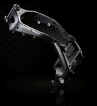 フロントフォークブラケットからエンジン後部へ弧を描き、スイングアームピボットからエンジン下部まで周り込む形状はMotoGPマシンでも採用されるスタイル。GPマシン同様にエンジンそのものも剛性メンバーとして利用されている。